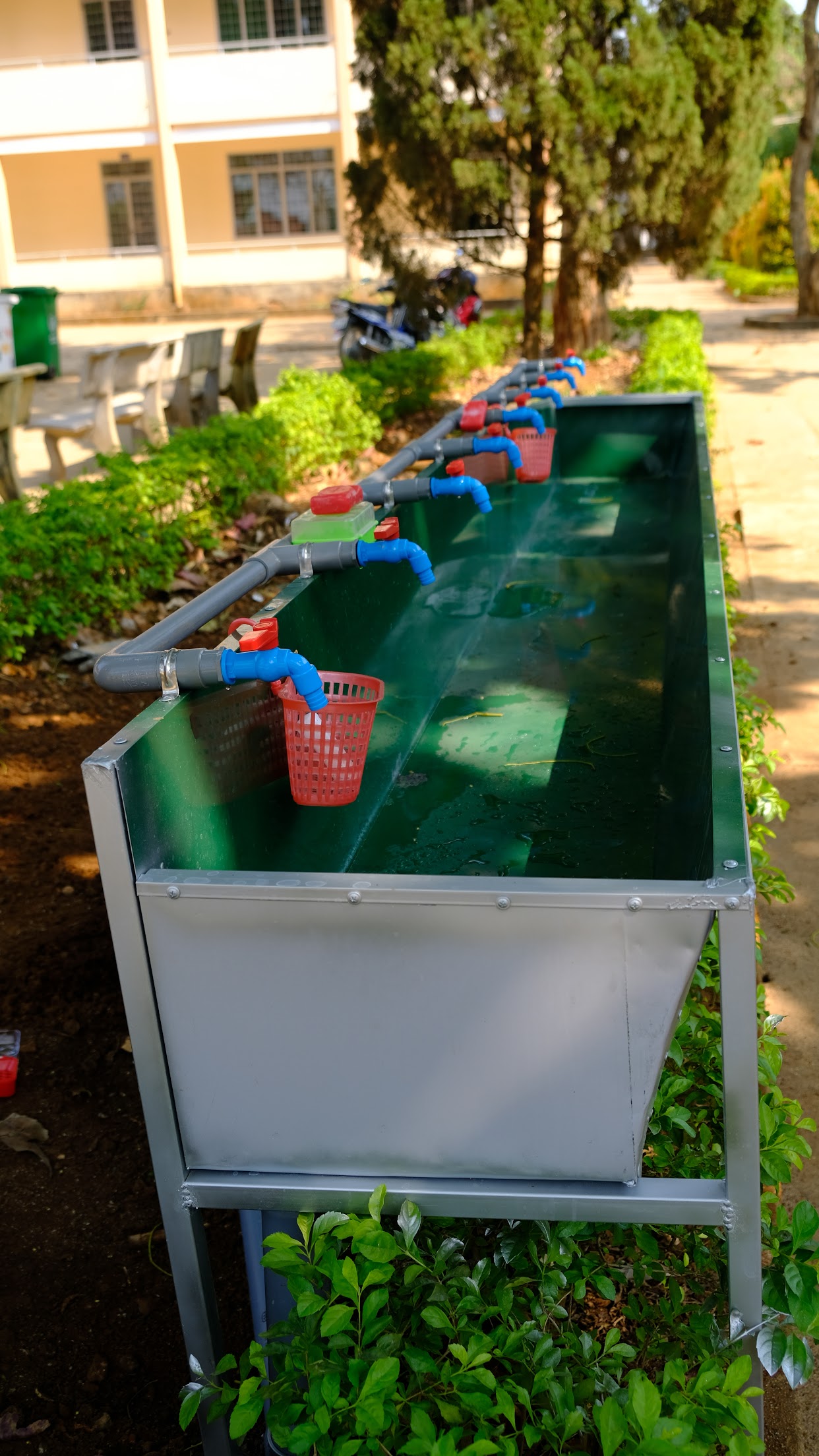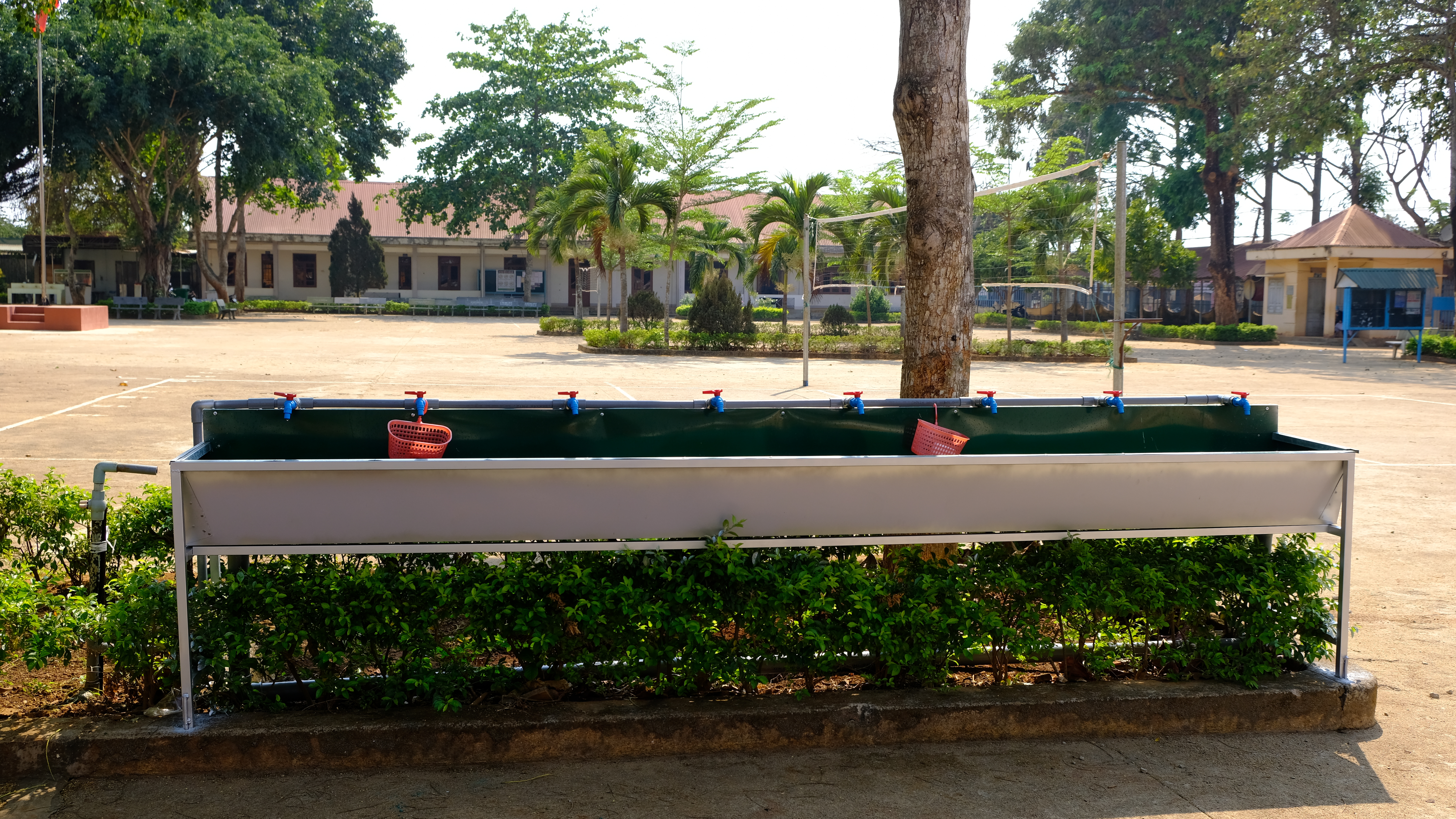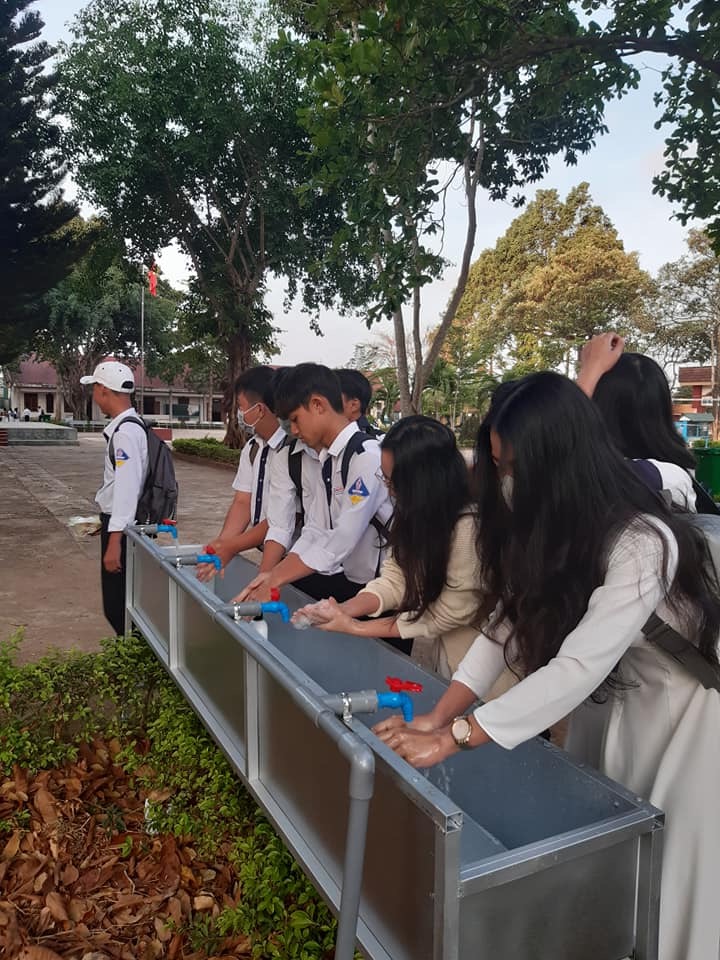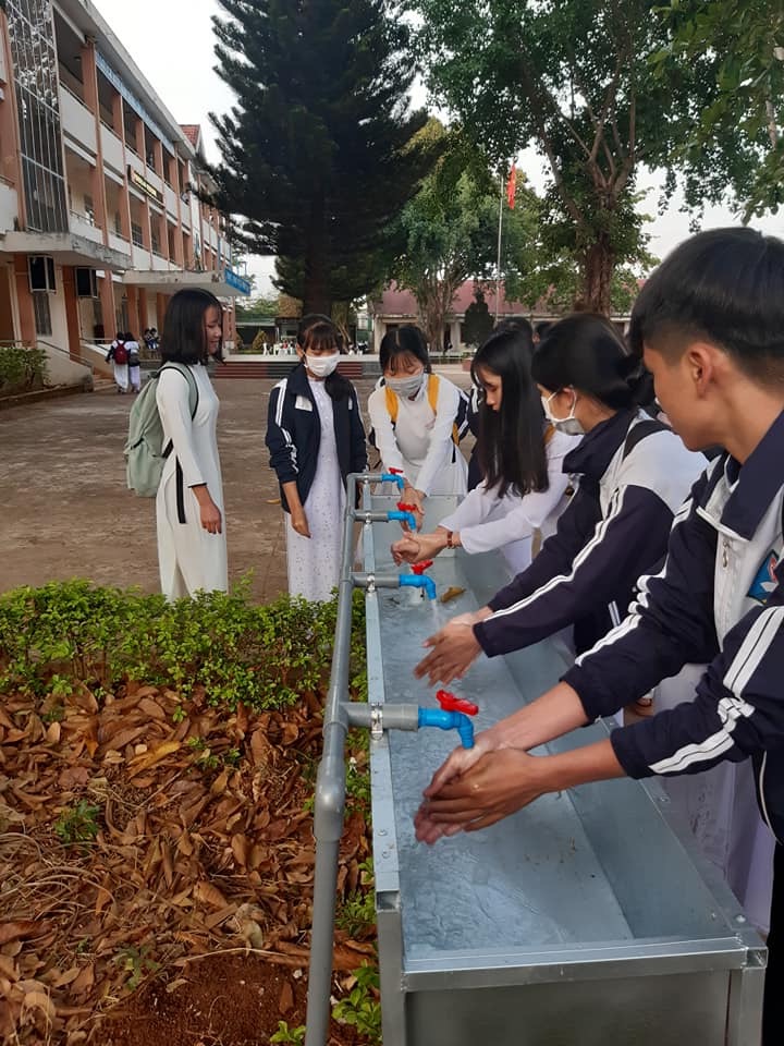 Thầy trò Trường THPT Krông Ana vệ sinh tay sạch sẽ trước khi vào lớp.