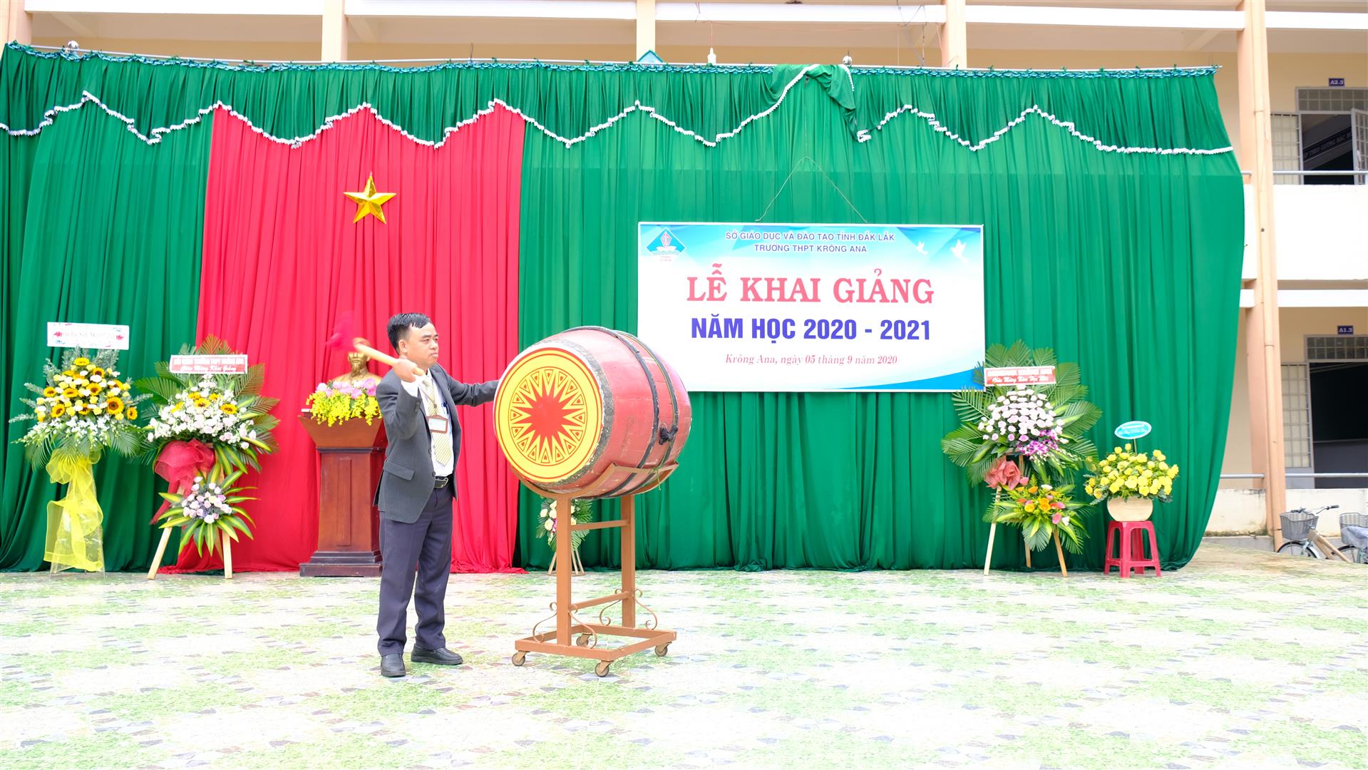 Thầy Vương Xuân Hồng, bí thư chi bộ, hiệu trưởng nhà trường đọc diễn văn khai giảng và đánh trống khai trường