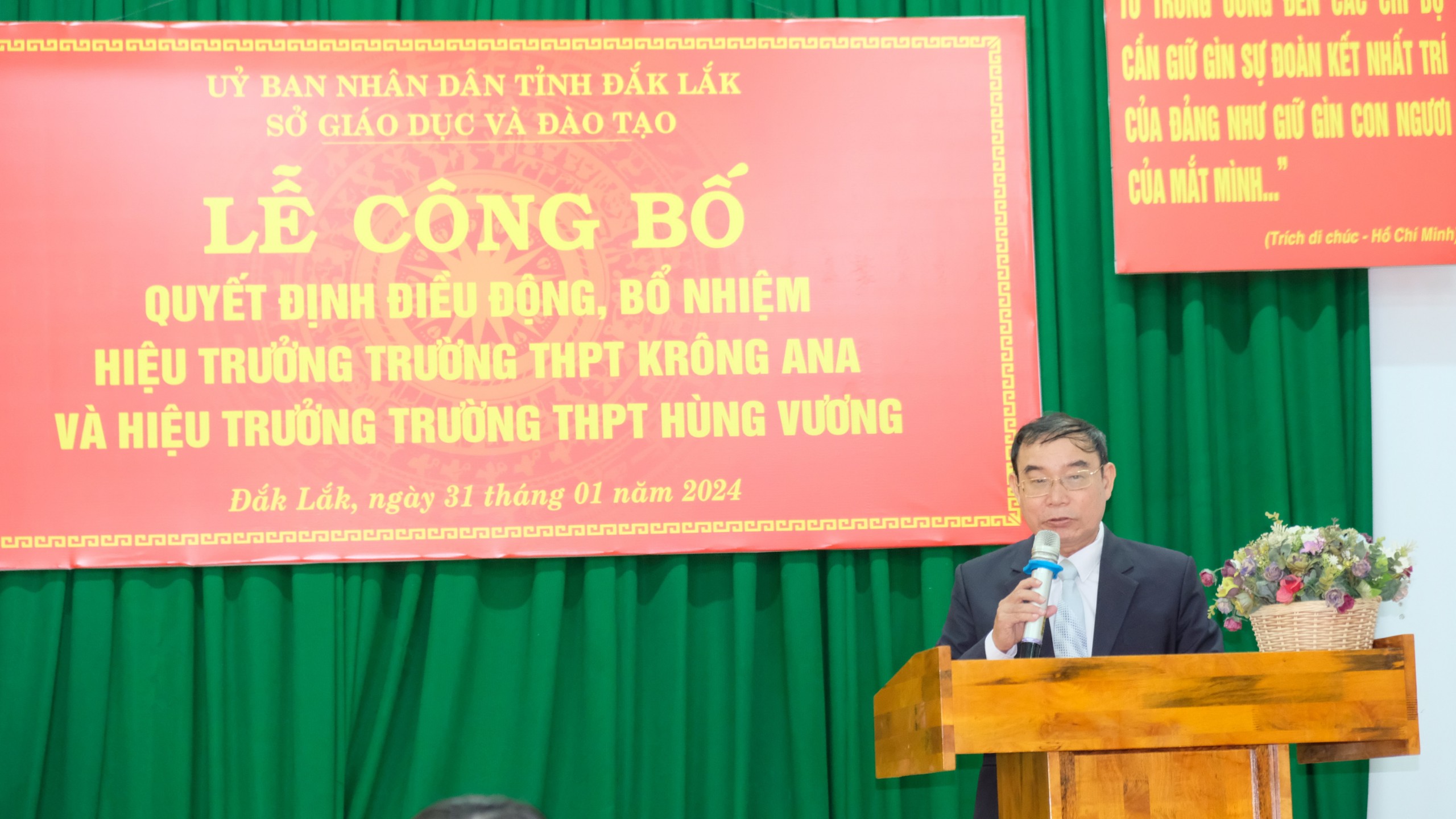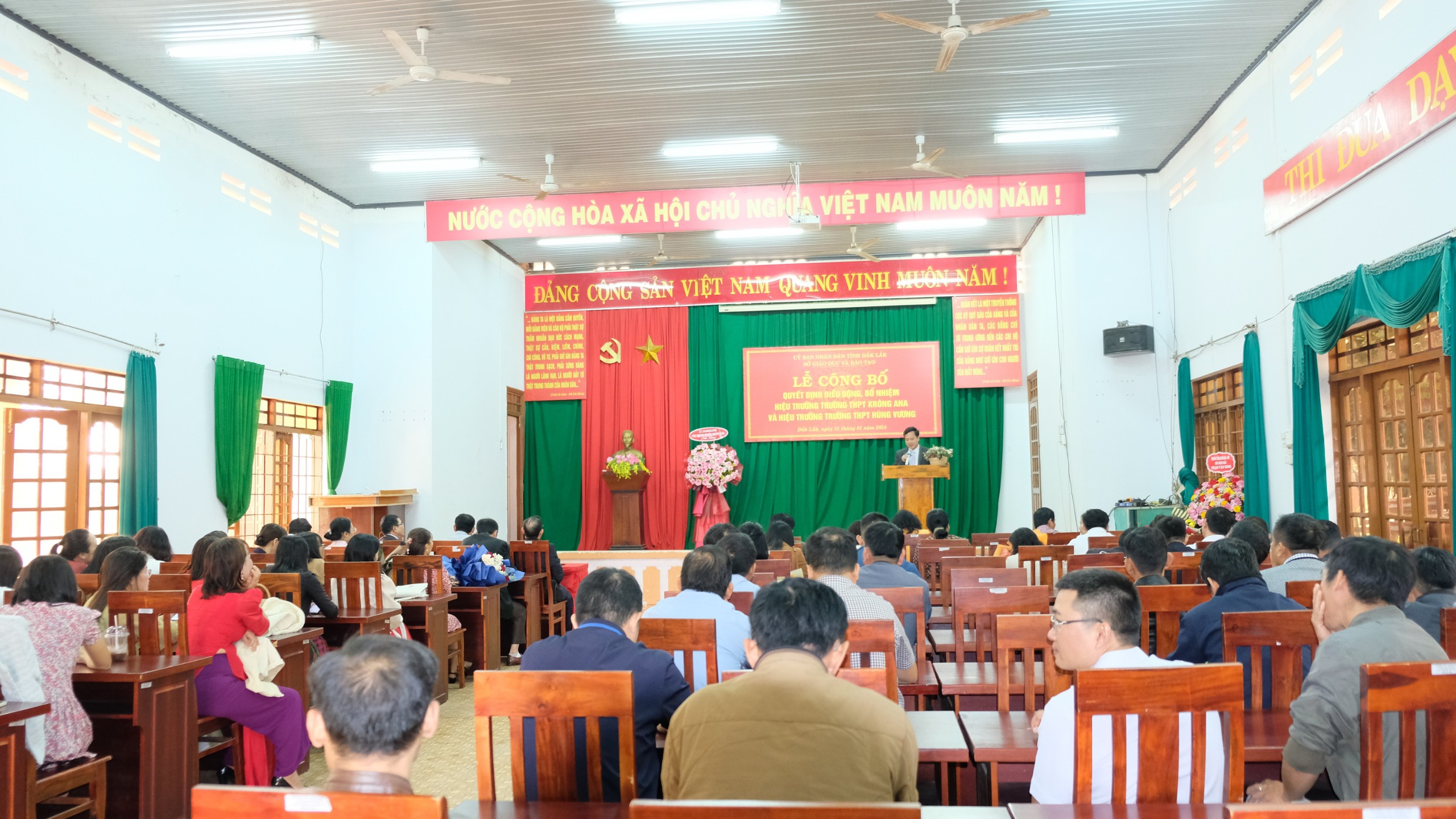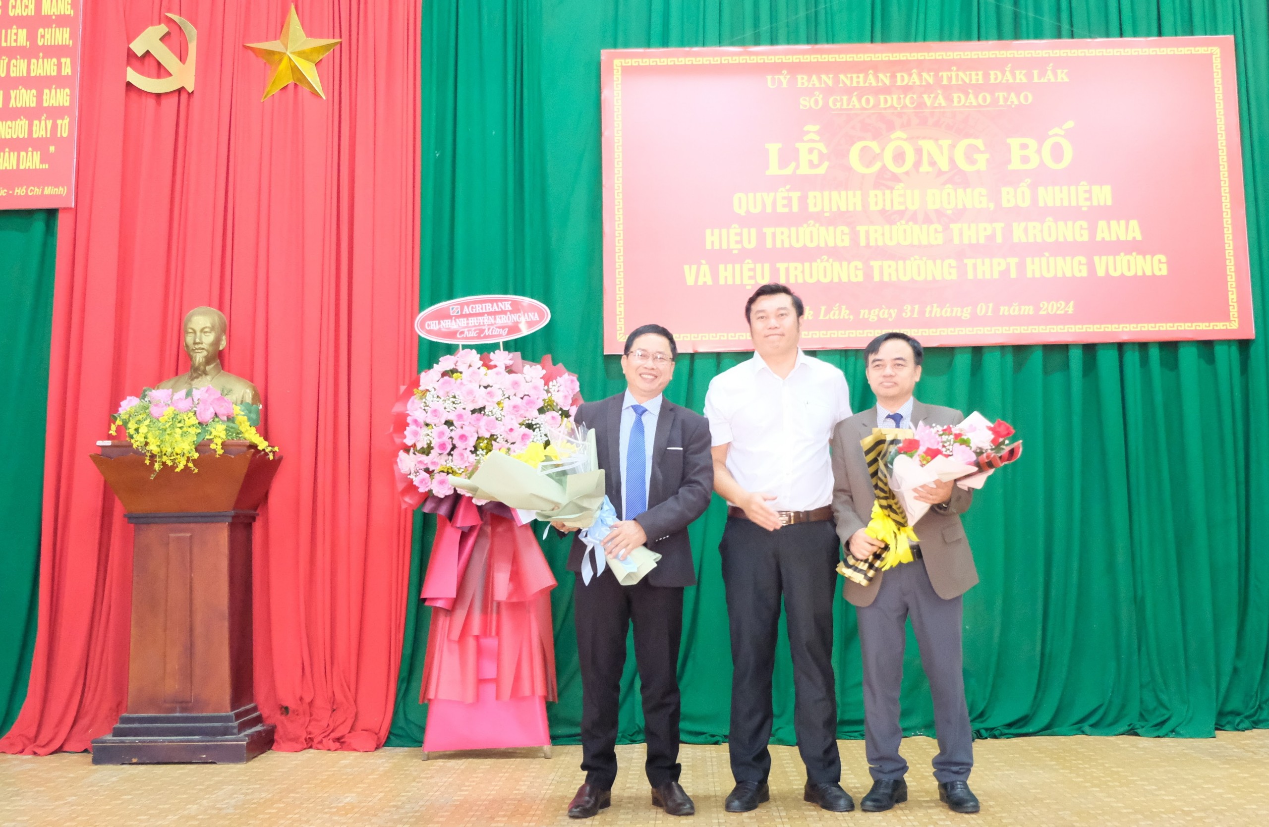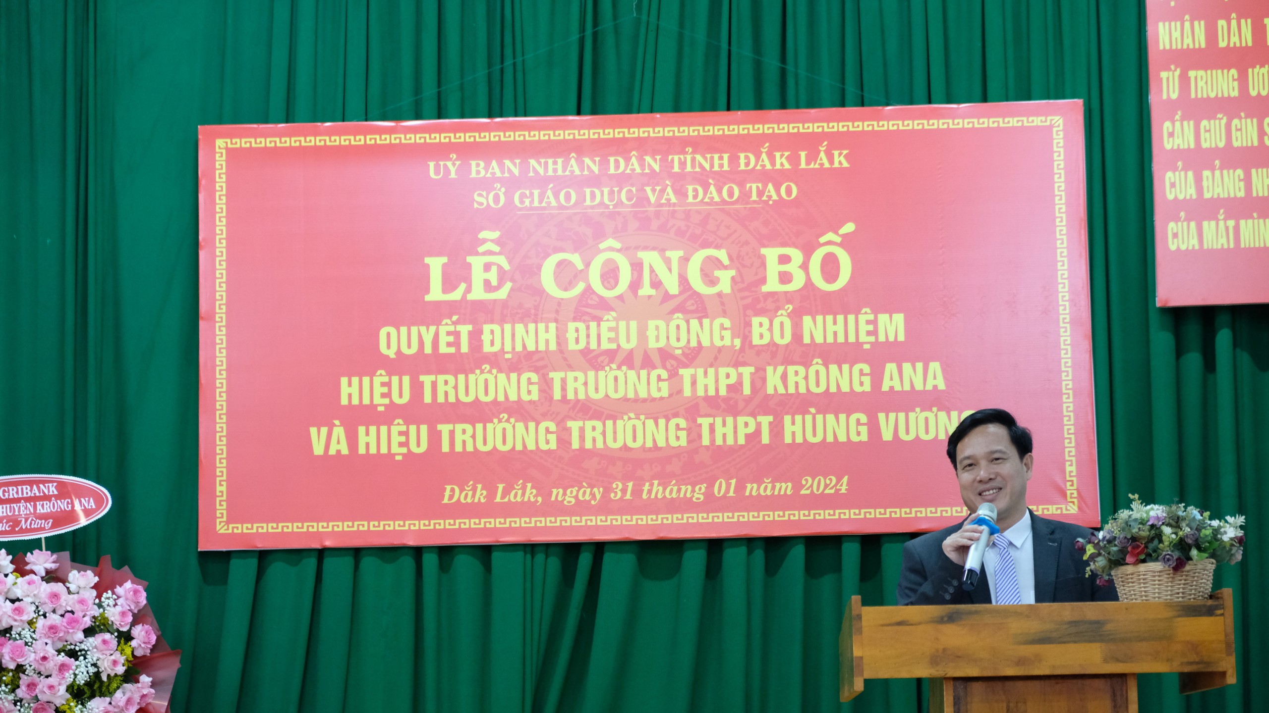 Sáng ngày 31 tháng 01 năm 2024, trường THPT Krông Ana long trọng tổ chức Lễ Công bố quyết định của Giám đốc Sở Giáo dục và Đào tạo Tỉnh Đắk Lắk về việc điều động, bổ nhiệm viên chức giữ chức vụ Hiệu trưởng Trường THPT. Theo quyết định Đồng chí Phạm Văn Ninh giữ chức vụ Hiệu trưởng Trường THPT Krông Ana và Đồng chí Vương Xuân Hồng giữ chức vụ Hiệu trưởng Trường THPT Hùng Vương.