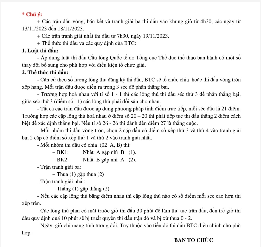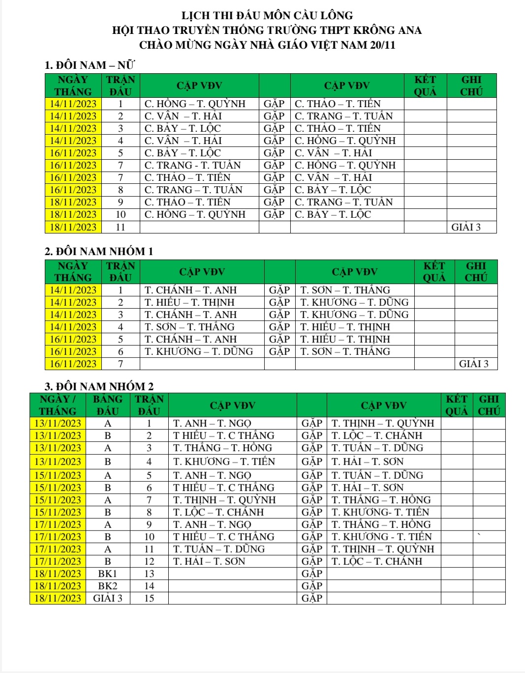 Lịch thi đâu bộ môn Cầu lông Hội thao truyền thống Trường THPT Krông Ana Chào mừng ngày ngày nhà giáo Việt Nam 20/11 năm 2023