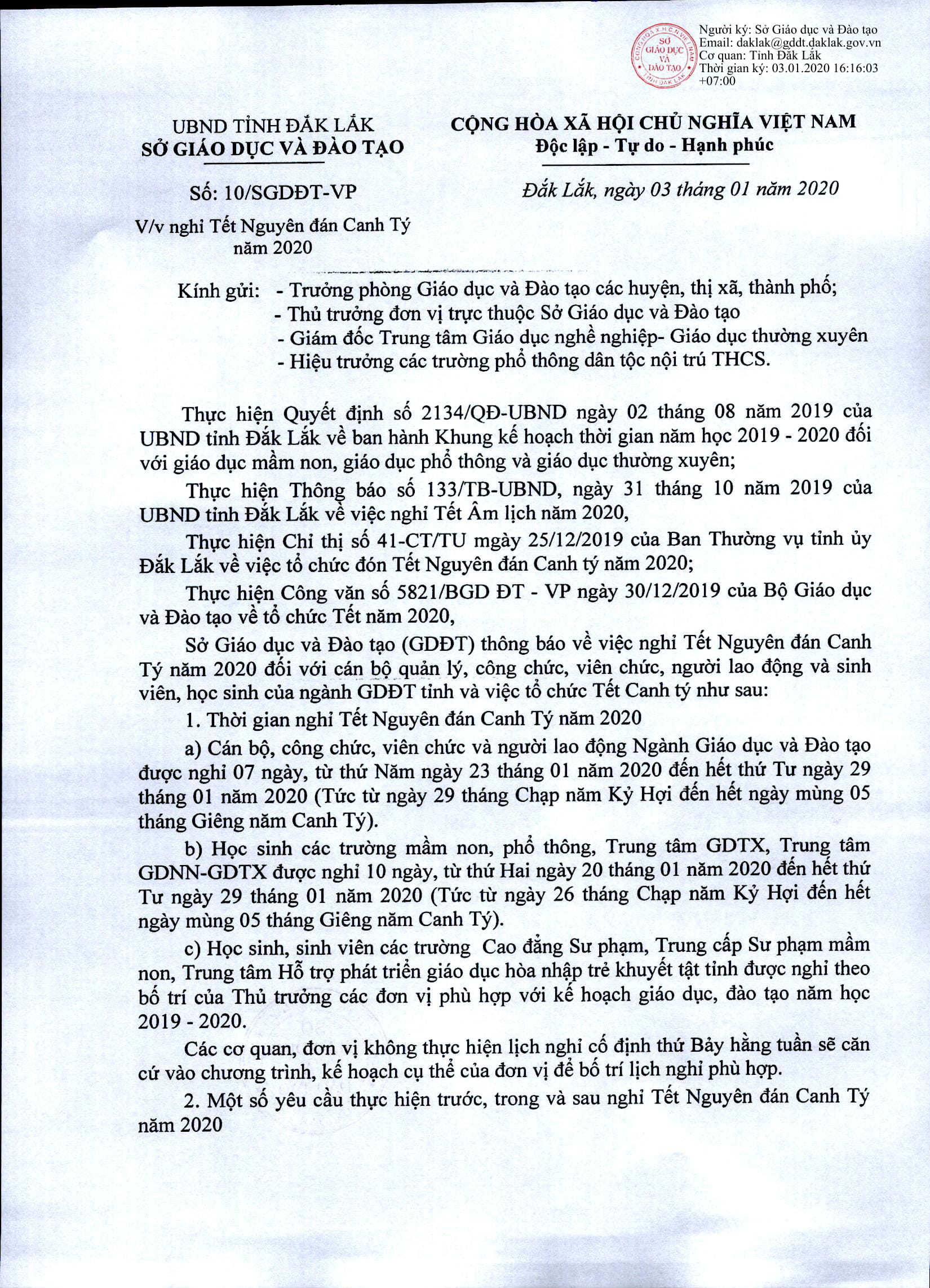 Công văn về nghỉ Tết Nguyên Đán Canh Tý năm 2020