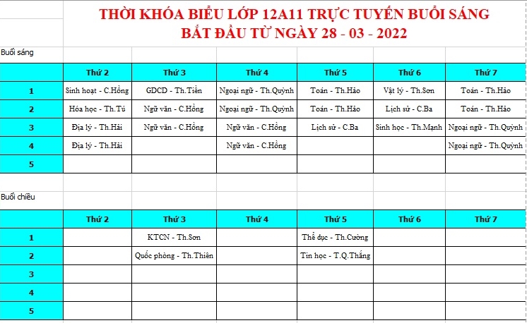 Thời khóa biểu lớp 12A11 (áp dụng từ 28/3/2022)