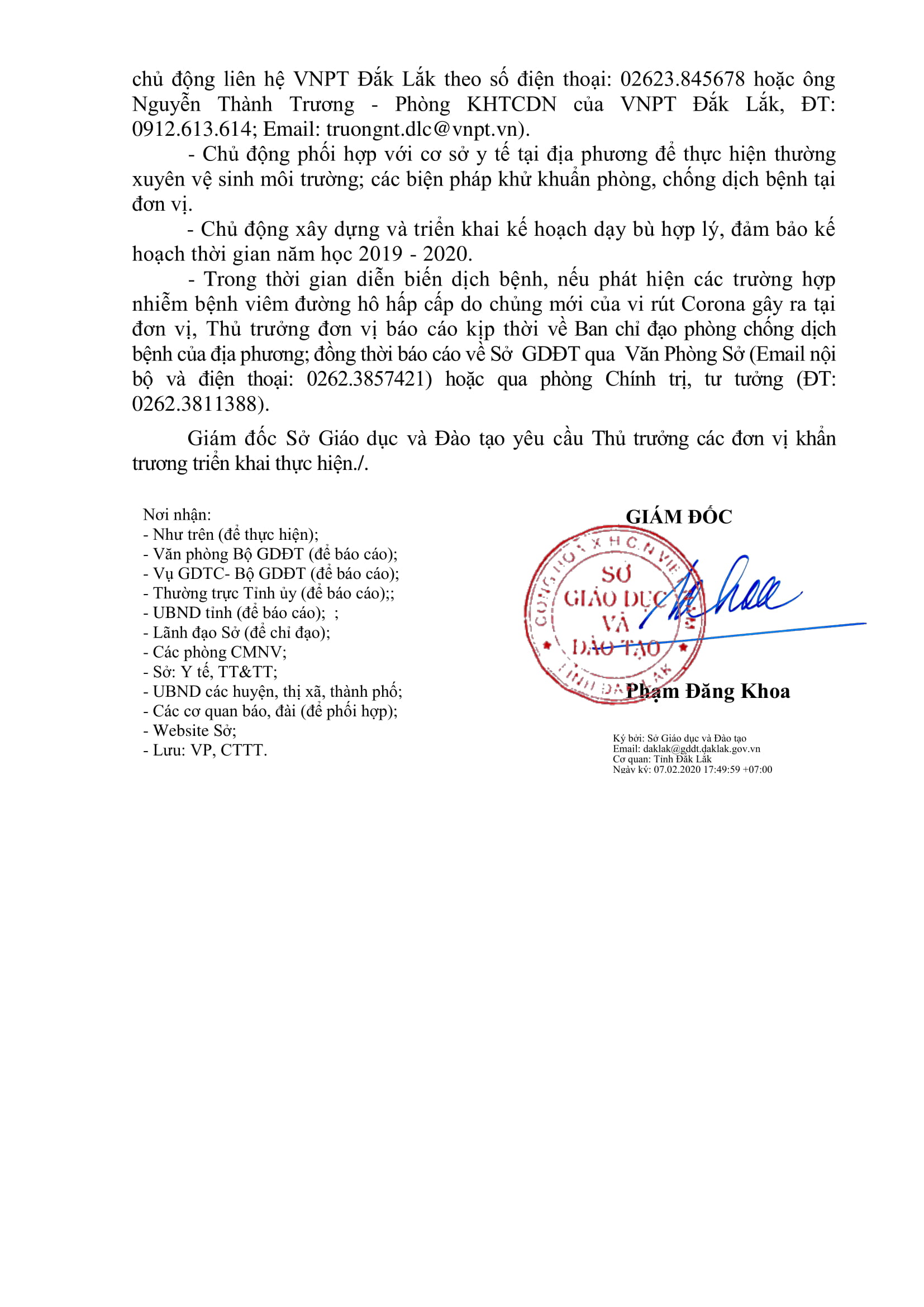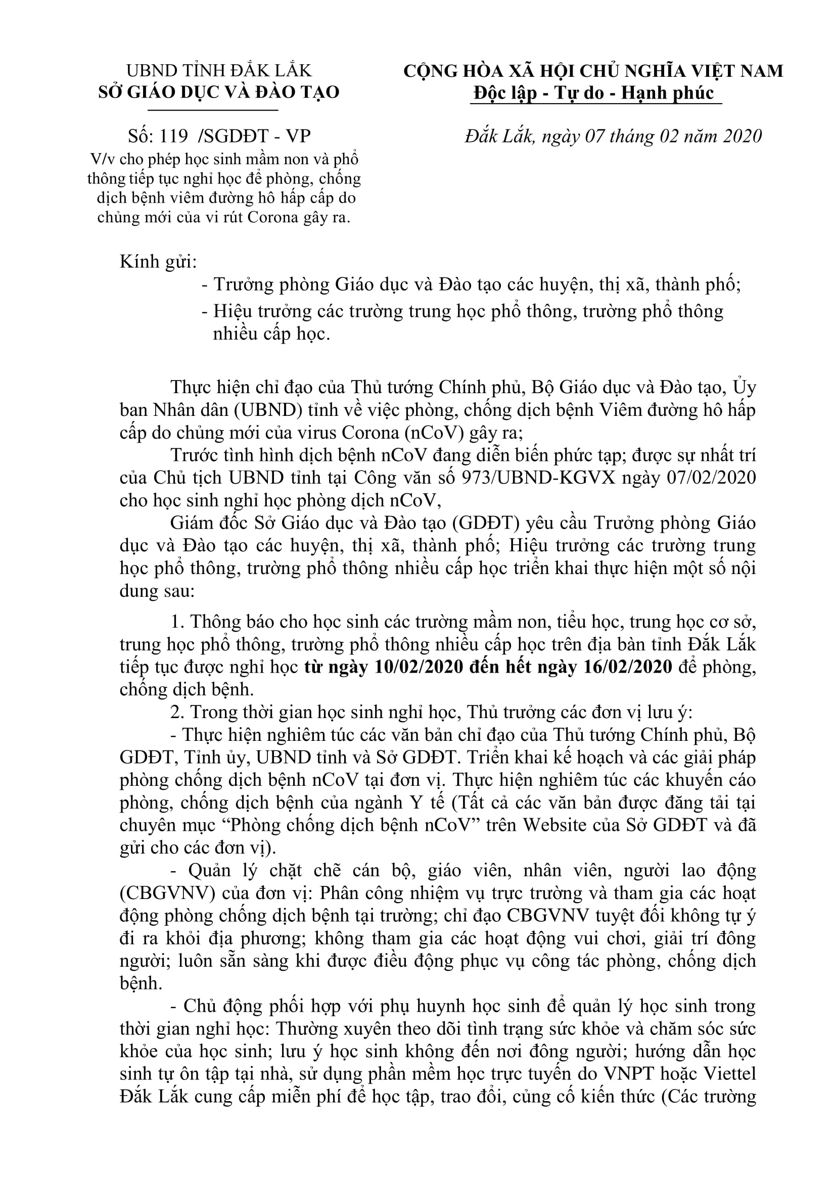 Thông báo học sinh nghỉ học từ 10/2/2020 đến hết 16/2/2020