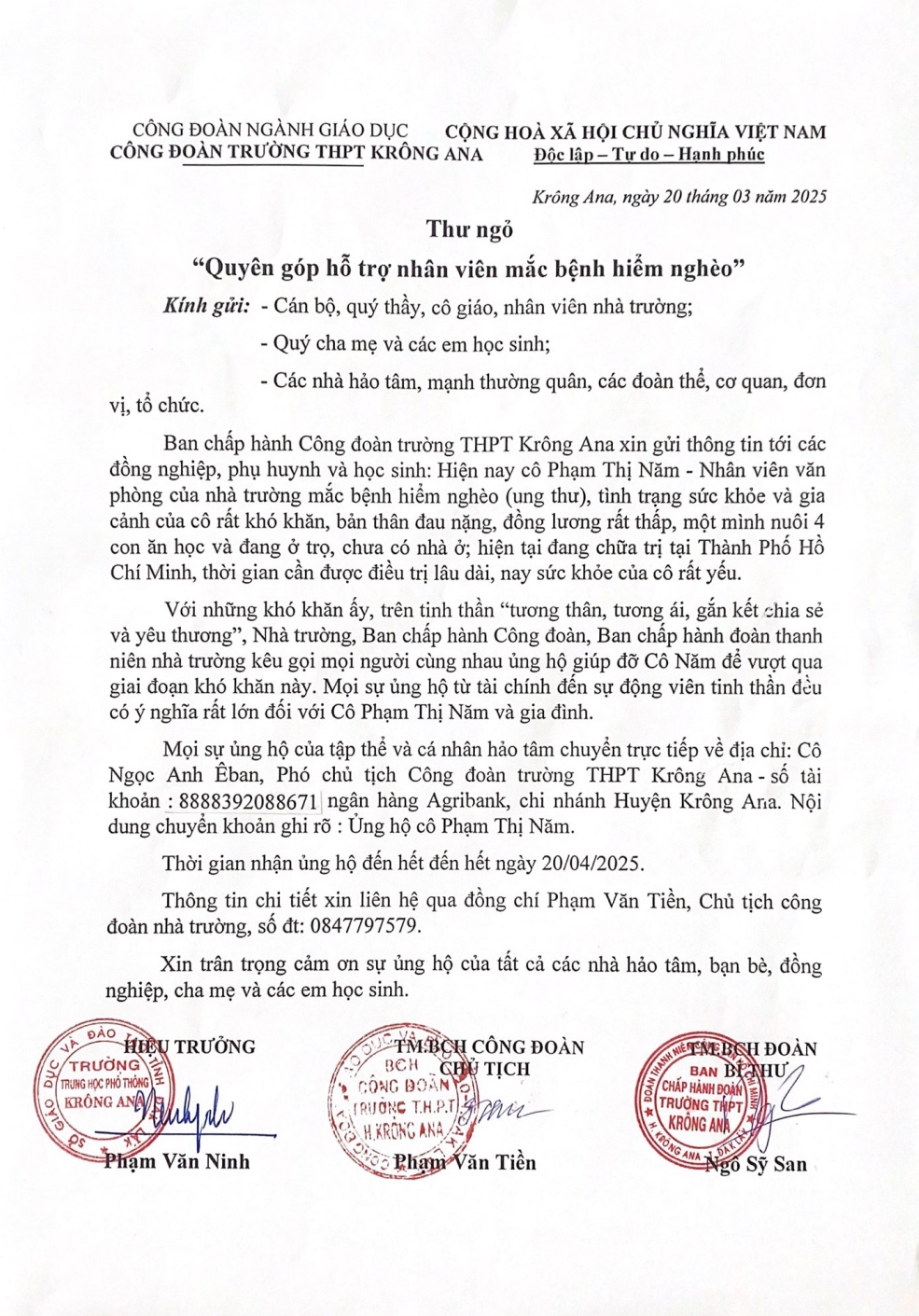 Thời gian nhận ủng hộ: đến hết ngày 20/04/2025.