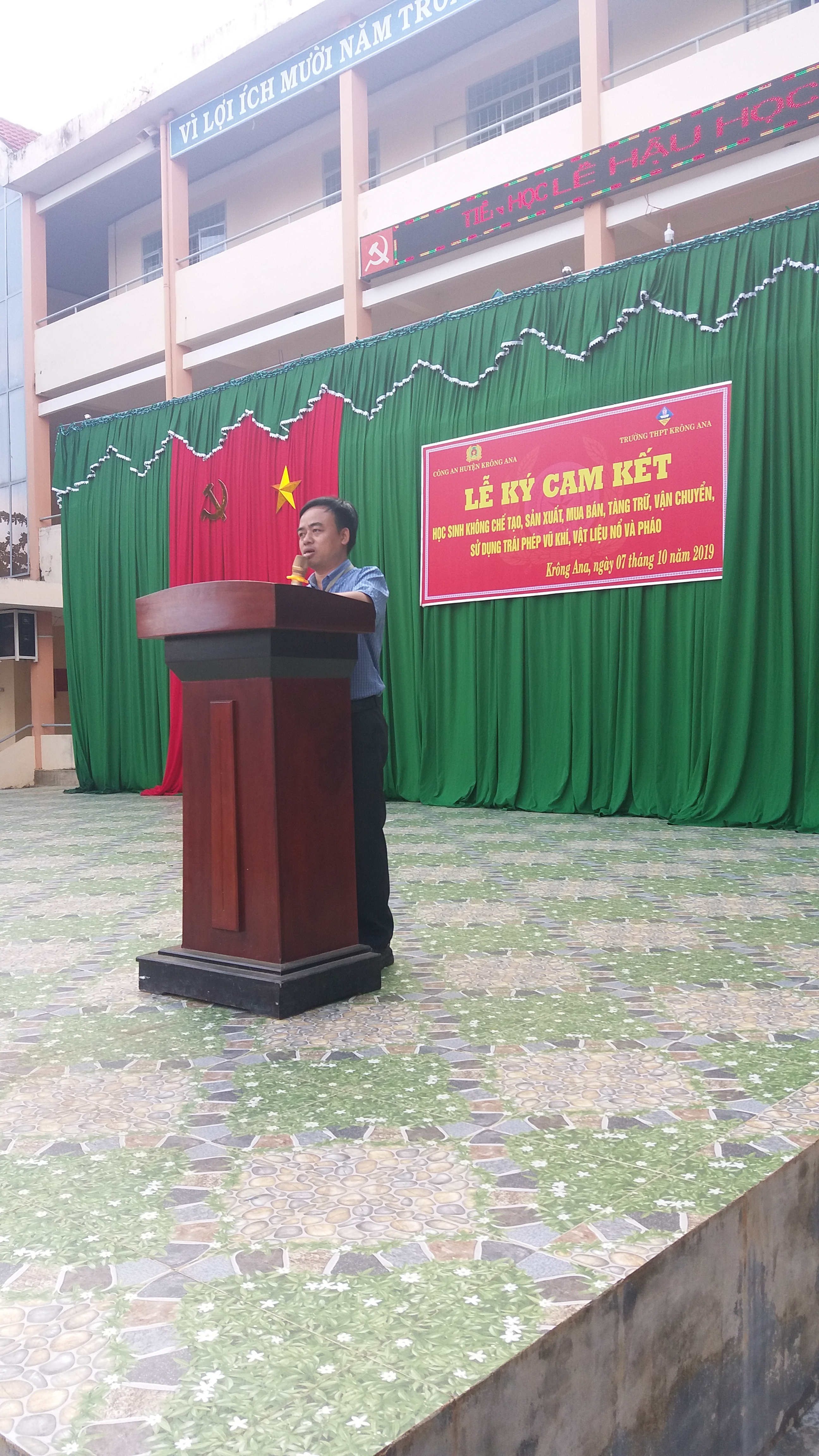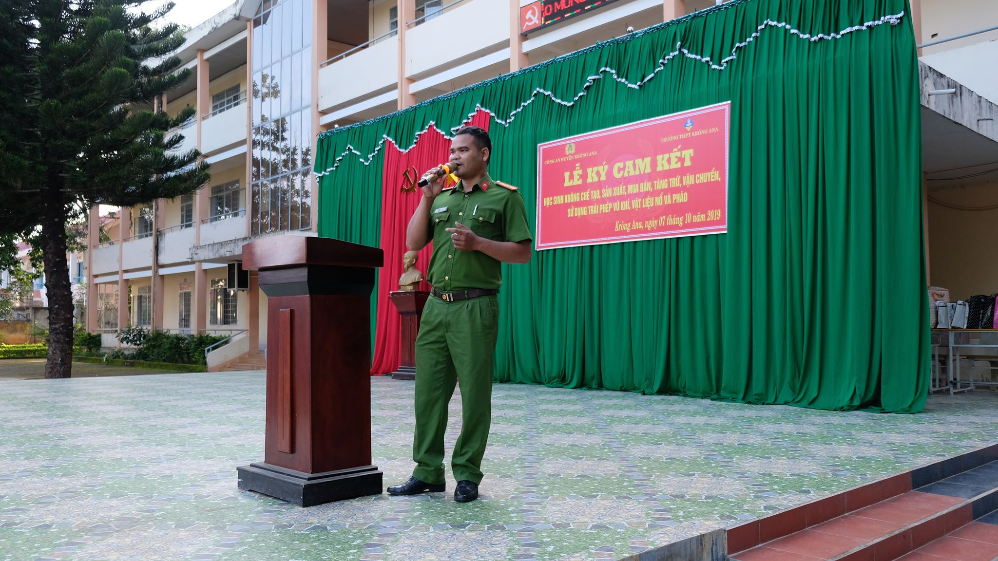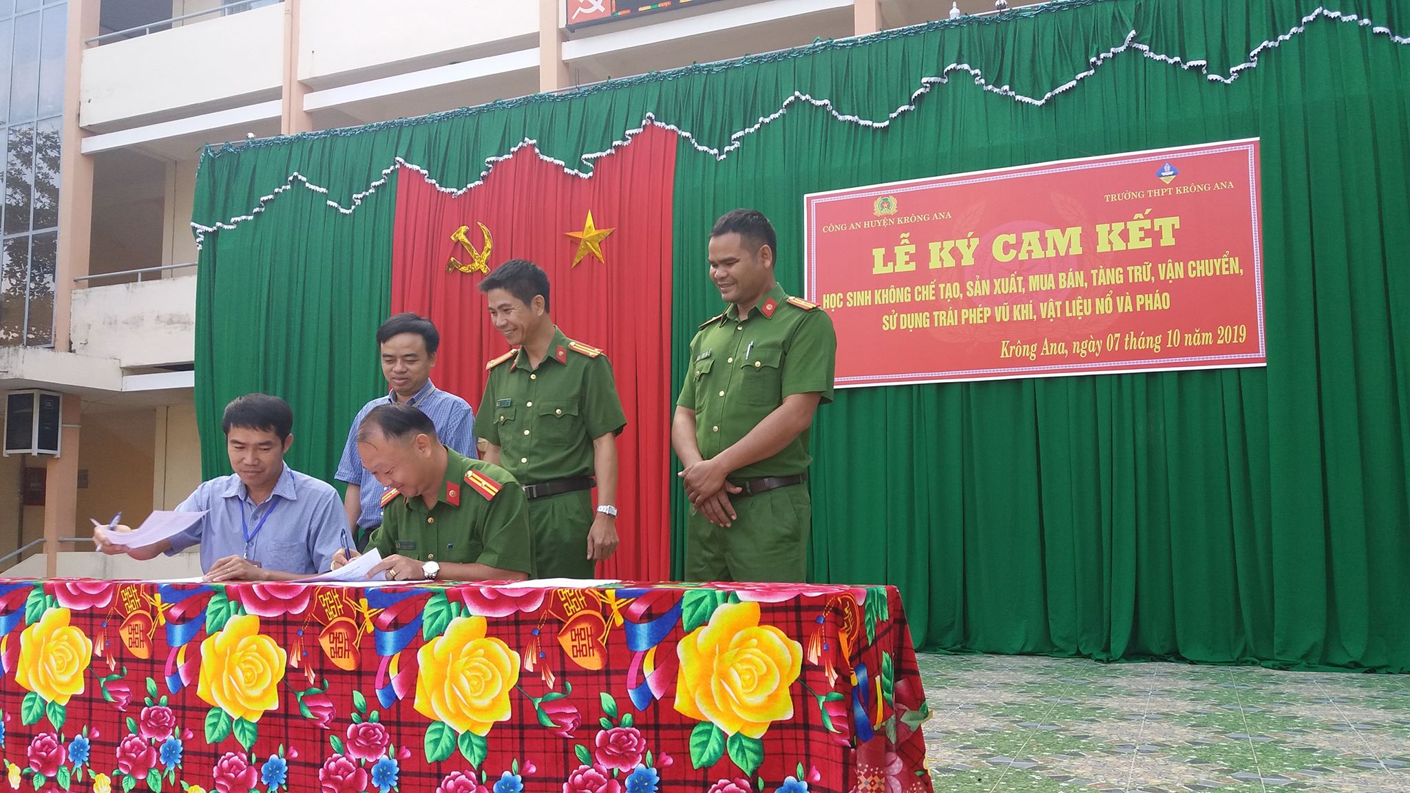Sáng nay, ngày 7 tháng 10 năm 2019, trong buổi lễ chào cờ đầu tuần, với sự tham dự của đại diện Công an huyện, BGH nhà trường, các thầy cô GVCN và HS toàn trường, Trường THPT Krông Ana đã tham gia ký cam kết HS không chế tạo, sản xuất, mua bán, tàng trữ, vận chuyển, sử dụng trái phép vũ khí, vật liệu nổ và pháo.