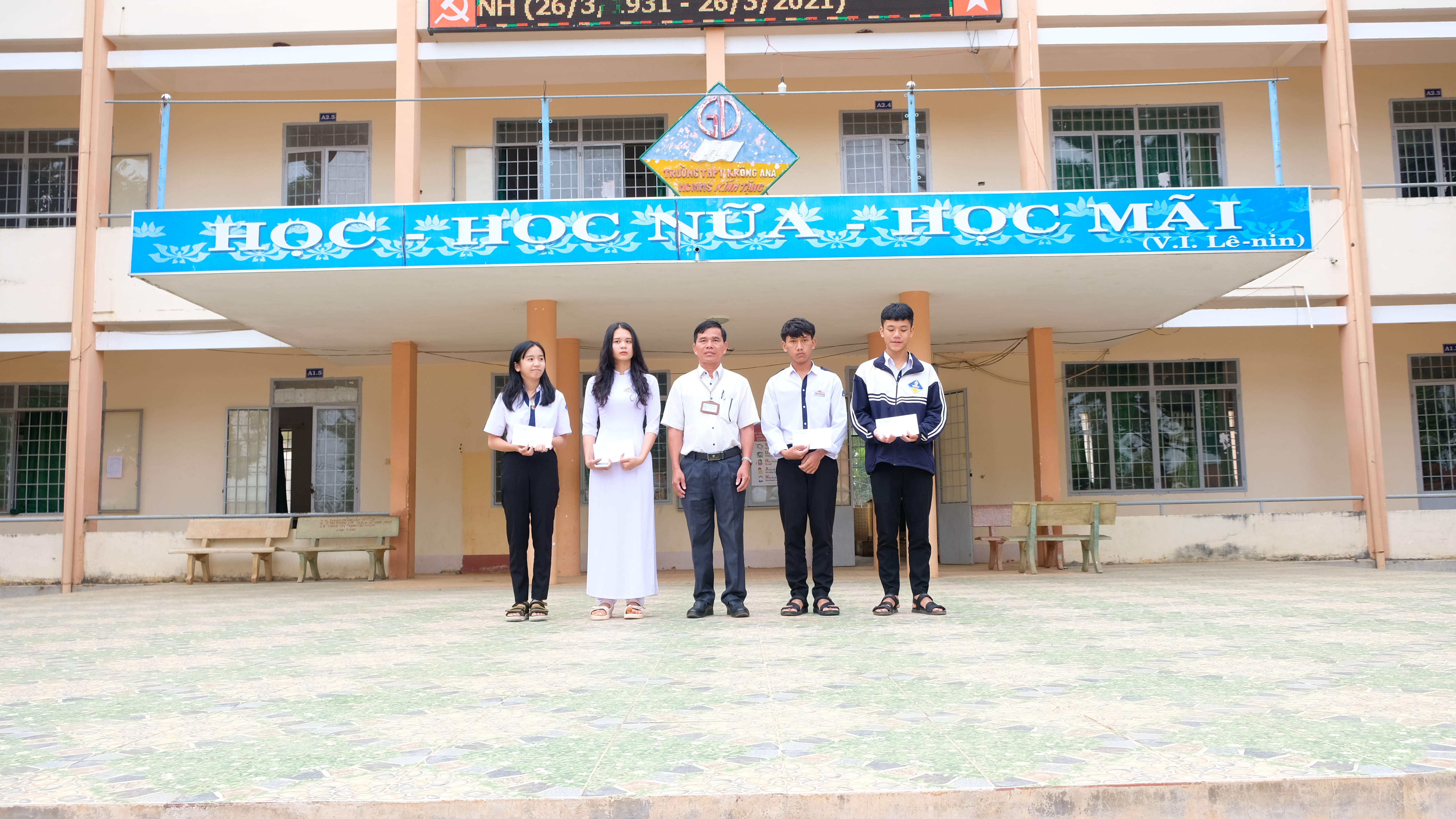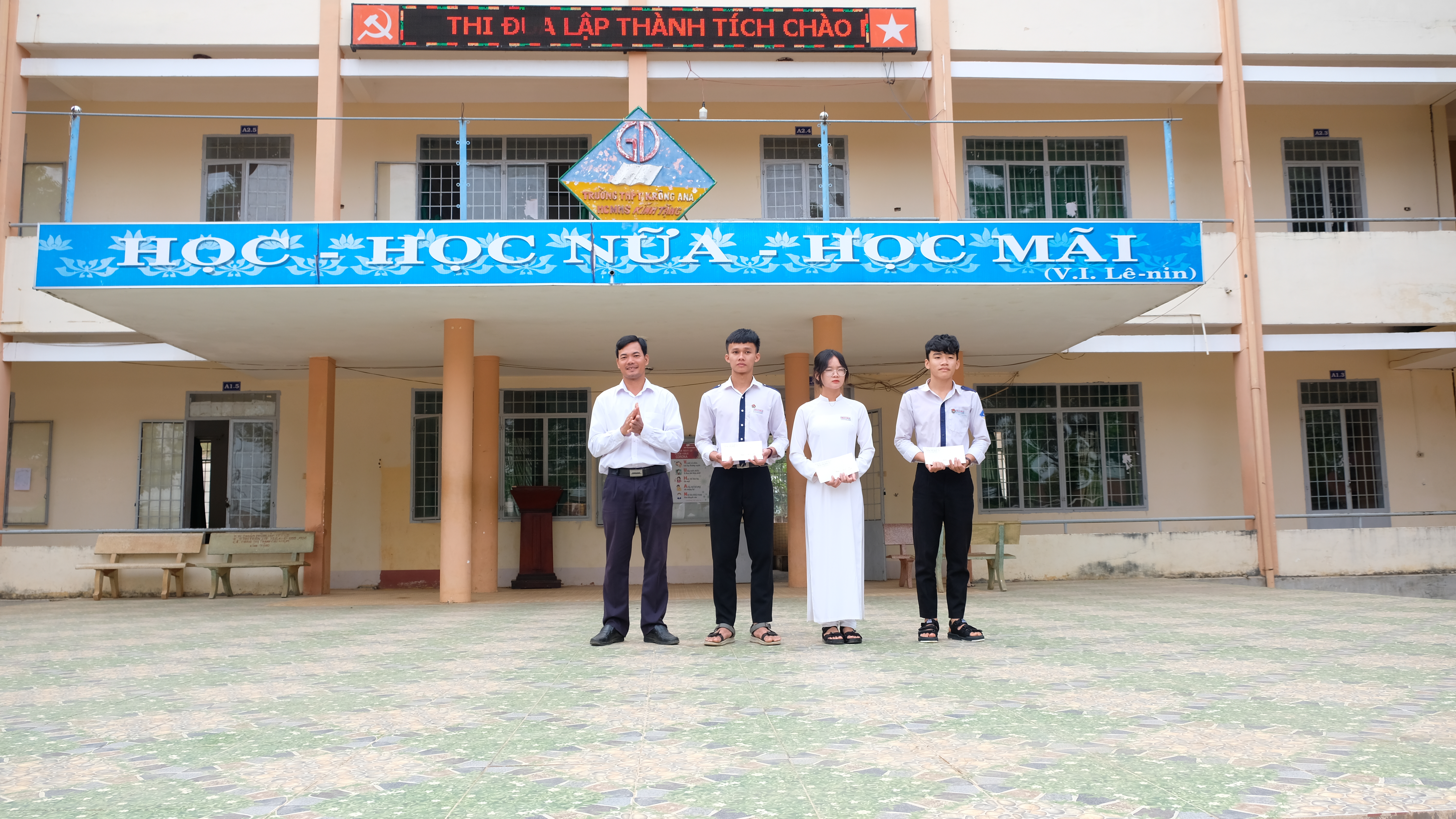 Thầy Ngô Văn Huynh, phó hiệu trưởng nhà trường trao phần thưởng cho các HS đạt giải II